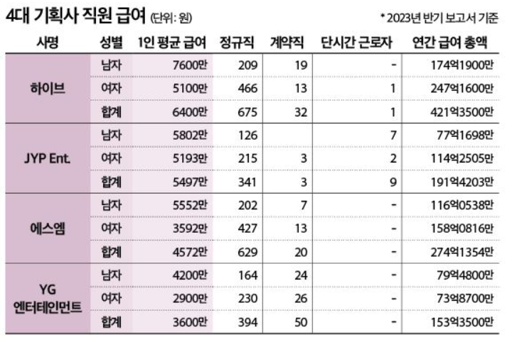 23년도 반기보고서 기준으로 4대 기획사 직원 급여가 나왔습니다. 하이브가 현재 제일 높은 연봉을 보여주고 있으며 남녀 차이가 총 2,500만원 정도 차이가 난다고 합니다. 같은 직급에서 저정도 차이가 나는 건 아닐 수도 있으니 위 내용은 참고만 해주시면 되겠습니다.